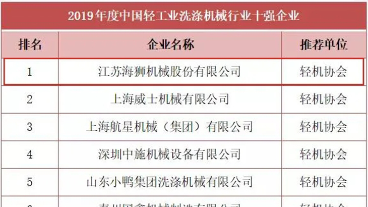 近日,中國輕工業(yè)聯(lián)合會(huì)揭曉了2019年度中國輕工業(yè)百強(qiáng)、輕工業(yè)裝備制造五十強(qiáng)、行業(yè)十強(qiáng)榜單,海獅機(jī)械榮登雙榜單。五十強(qiáng)年度中國輕工業(yè)裝備制造行業(yè)五十強(qiáng)榜單由中國輕工機(jī)械協(xié)會(huì)推薦的有22家企業(yè)榮登2019年度中國輕工業(yè)裝備制造行業(yè)五十強(qiáng)榜單,海獅機(jī)械排名第13位。行業(yè)十強(qiáng)年度中國洗滌機(jī)械行業(yè)十強(qiáng)榜單由中國輕工機(jī)械